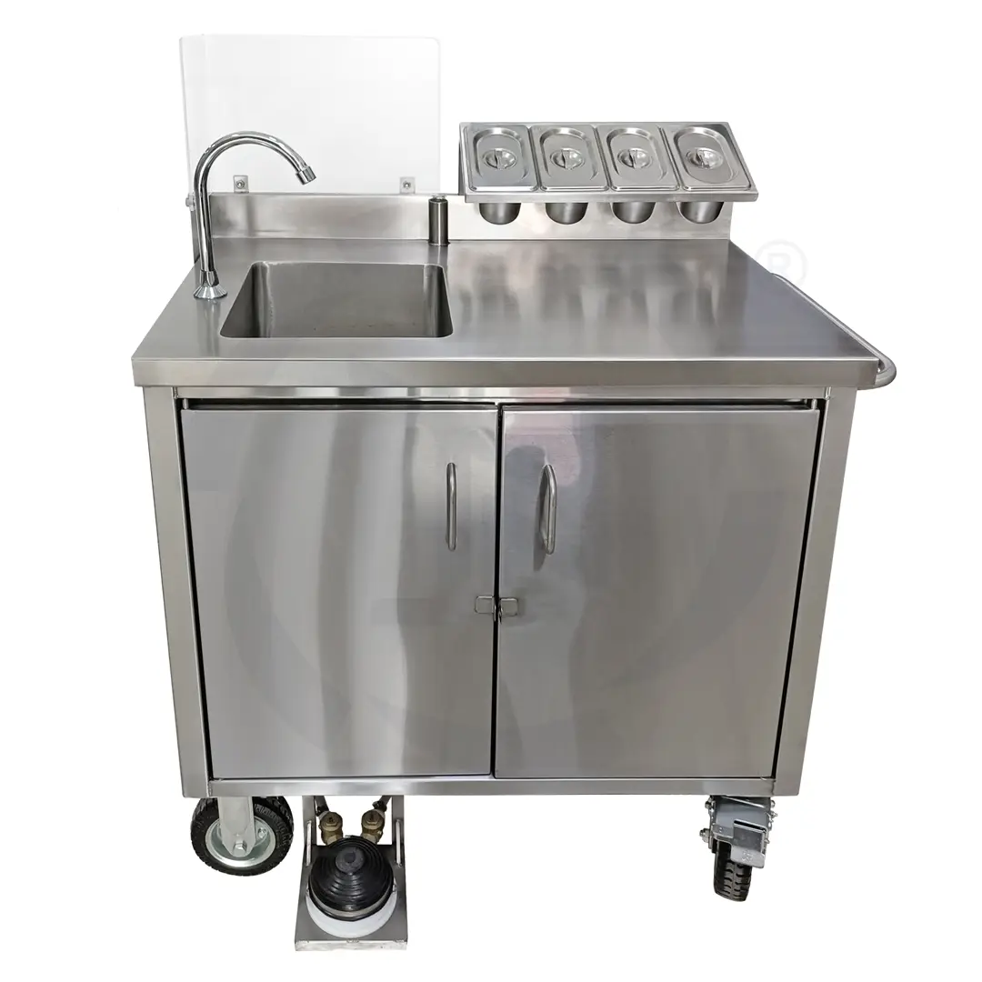 Carro de Frutas fabricado en acero inoxidable. Grifo y lavamanos. Bandeja de alimentos. Juego de azafates. Tanques de suministro y recolección de agua. Válvula de pedal. Rodachinas para trabajo pesado. -